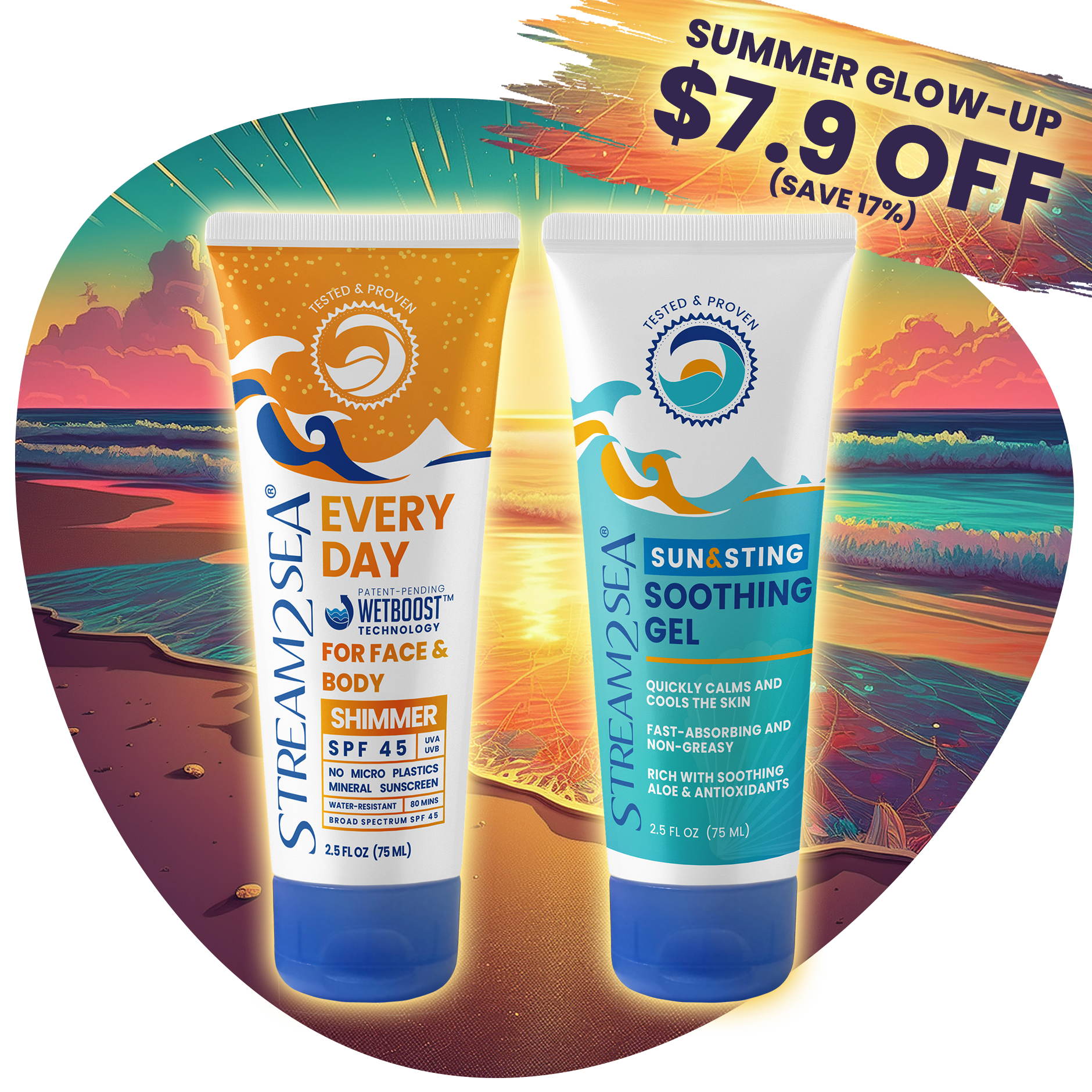 The Summer Glow-Up Duo pairs our radiant Shimmer Sunscreen ($28.95) with our ultra-soothing Sun & Sting Gel ($12.95) to keep your skin protected during the day and calm after sun, bites, and irritation.